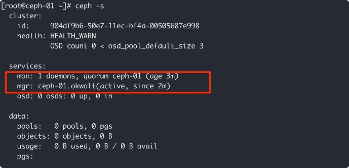 然后我们可以通过 ceph -s查看当前集群的状态。